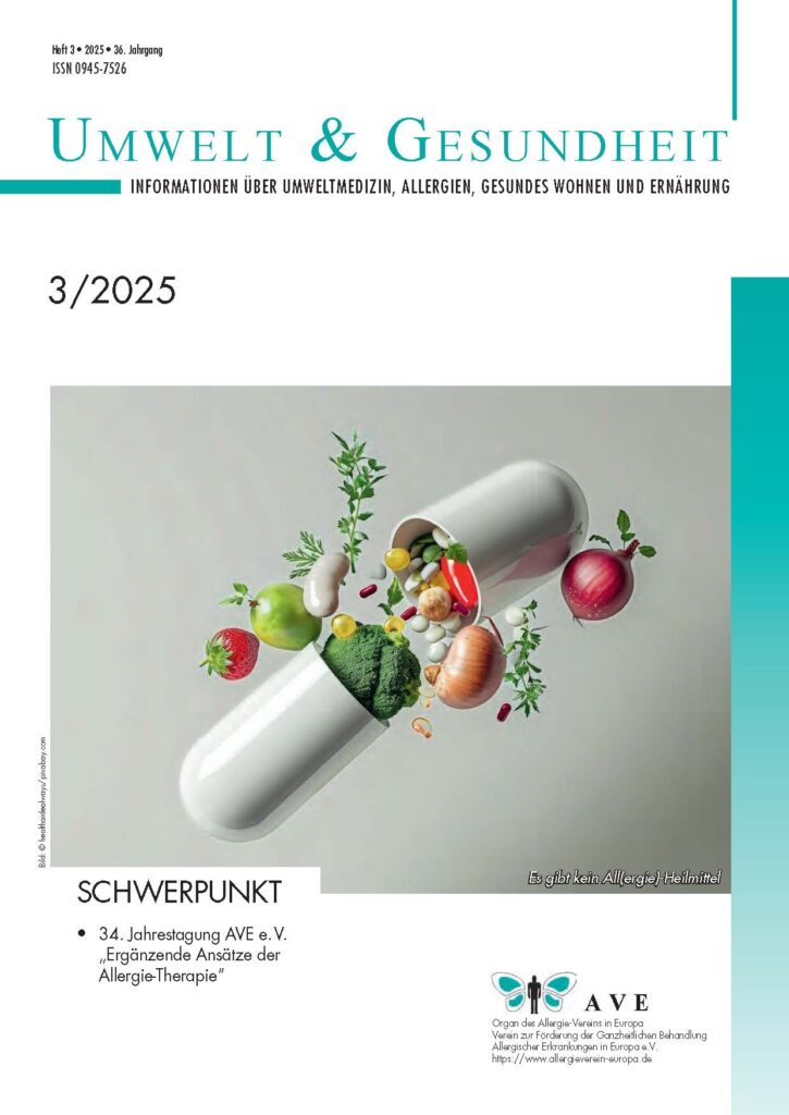 Ausgabe 3-2025 stellt die 34. Jahrestagung des AVE e.V. zum Thema „Ergänzende Ansätze der Allergie-Therapie“ in den Vordergrund. Im Tagungsband werden Beiträge von Therapieeinrichtungen und des AVE-Vorstandes vorgestellt. Weitere Themen sind Allergien auf Nüsse, Kontakt- und Arbeitsstoffe.
